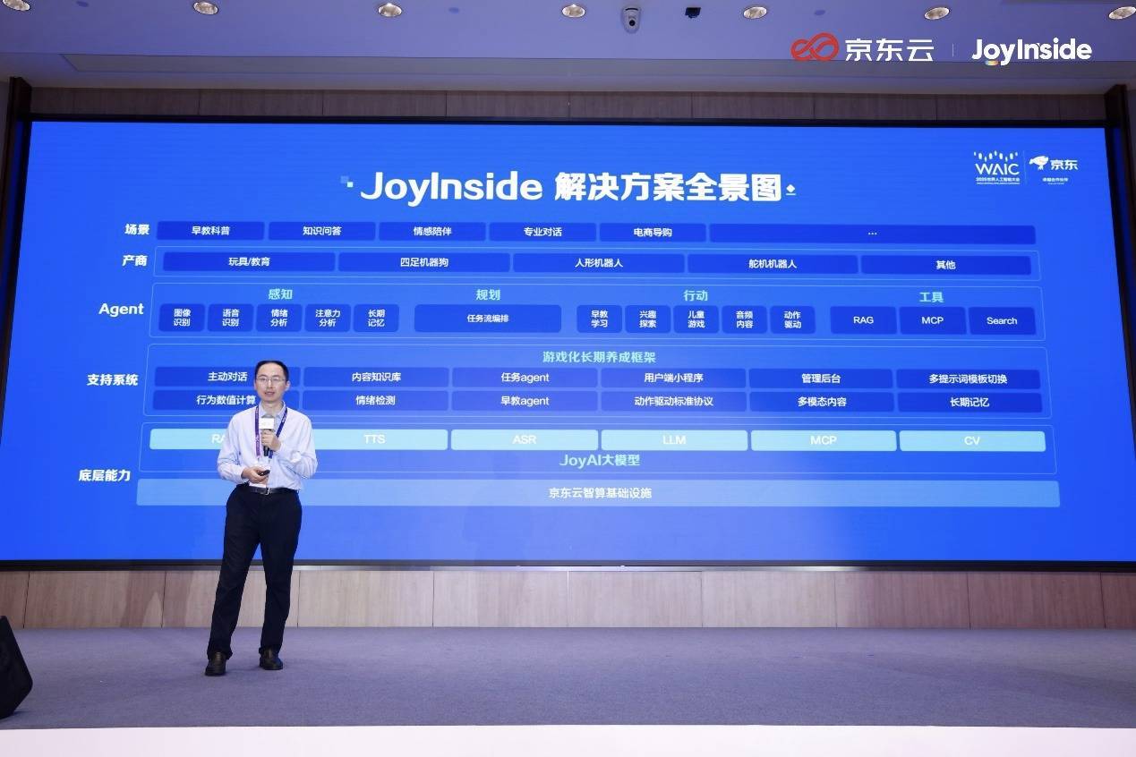 在底层,通过京东云提供智算基础设施,并整合RAG、TTS、ASR、LLM等多模态能力,让企业开箱即用;在支持系统层,搭建主动对话、情绪检测、长期记忆等功能模块,并配套游戏化长期养成框架;在儿童教育、陪伴类场景,这些模块可赋予智能体“理解-决策-执行”的完整服务能力,实现产品的个性化交互;在产业对接方面,已覆盖玩具/教育、人形/四足机器人等多元品类。